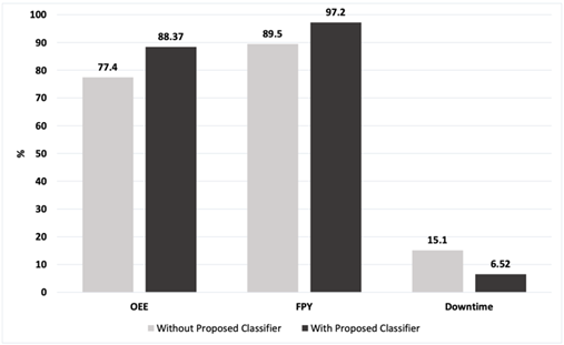 To evaluate the proposed solution’s performance, three Key Performance Indicators (KPIs), the Overall Equipment Effectiveness (OEE) [12], First Pass Yield (FPY), and Downtime. These KPIs were calculated before and after using the predictive quality solution. Fig. 2 shows the values of these KPIs before and after the solution, and it is possible to see an improvement in these KPIs.